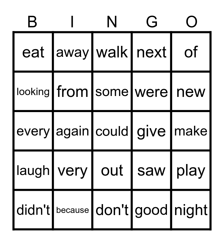 This bingo card has a free space and 29 words: didn't, when, again, why, eat, walk, from, very, give, because, make, night, don't, good, new, many, out, laugh, of, every, saw, does, were, looking, next, away, play, some and mom.