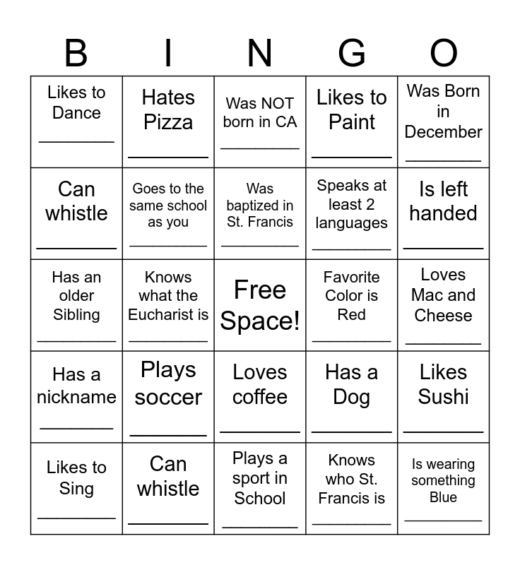 This bingo card has a free space and 24 words: Plays soccer ______, Can whistle _______, Was baptized in St. Francis __________, Likes to Sing ________, Was Born in December ________, Likes to Dance ________, Can whistle _______, Hates Pizza _______, Favorite Color is Red _________, Loves coffee _______, Speaks at least 2 languages _________, Has an older Sibling _________, Has a Dog _______, Likes Sushi _______, Goes to the same school as you __________, Knows who St. Francis is _________, Loves Mac and Cheese ________, Was NOT born in CA _________, Is left handed _______, Knows what the Eucharist is _________, Is wearing something Blue __________, Has a nickname _______, Likes to Paint _______ and Plays a sport in School ________.