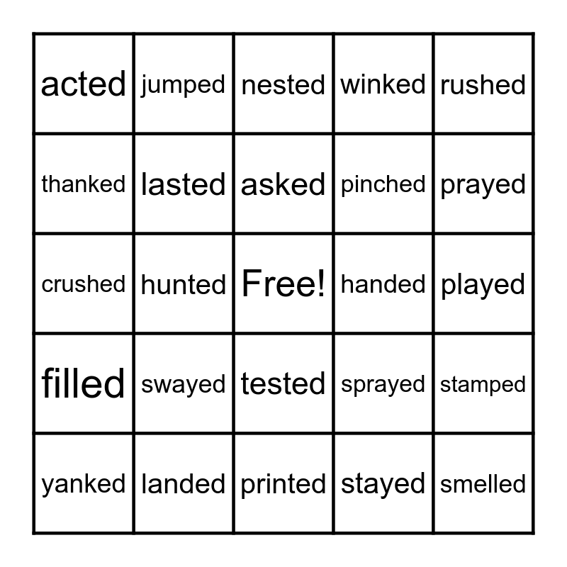 This bingo card has a free space and 30 words: landed, melted, hunted, sifted, acted, nested, lasted, tested, handed, printed, played, smelled, stayed, spelled, prayed, yelled, sprayed, filled, swayed, rushed, crushed, rocked, jumped, pinched, thanked, winked, stamped, yanked, asked and echoed.