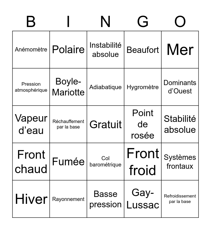 This bingo card has a free space and 24 words: Fumée, Rayonnement, Adiabatique, Hiver, Mer, Anémomètre, Pression atmosphérique, Polaire, Point de rosée, Col barométrique, Hygromètre, Vapeur d’eau, Front froid, Systèmes frontaux, Boyle-Mariotte, Gay-Lussac, Stabilité absolue, Instabilité absolue, Dominants d’Ouest, Réchauffement par la base, Refroidissement par la base, Front chaud, Beaufort and Basse pression.