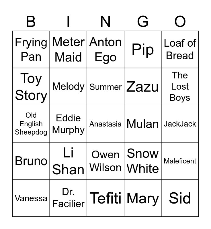 This bingo card has 35 words: Candlestick, Harryhousen's, Coral, Melody, Owen Wilson, Pip, Toy Story, "No Worries", Summer, Phil, Old English Sheepdog, Loaf of Bread, Angus, Midnight, Frying Pan, Mulan, Mary, Eddie Murphy, Bruno, Anastasia, Snow White, Vanessa, Maleficent, Dr. Facilier, Anton Ego, The Lost Boys, Sid, Shoeshop, Zazu, JackJack, Llama, Tefiti, Li Shan, Meter Maid and Joy.