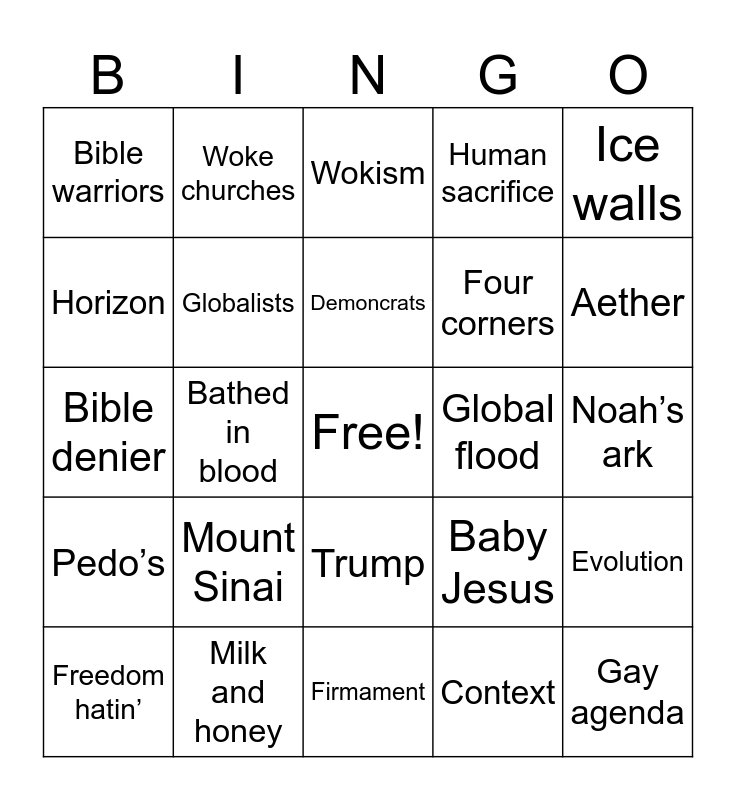 This bingo card has a free space and 39 words: Demons, Witches, Space lasers, Globalists, Freedom hatin’, Trump, Demoncrats, Rino’s, Ice walls, Pedo’s, Bathed in blood, Human sacrifice, Gay agenda, Noah’s ark, Global flood, Mount Sinai, Transgender, Bible warriors, God’s children, Baby Jesus, Horizon, Firmament, Four corners, Aether, Christian Science, Intelligent design, Talking snake, Rib woman, Forbidden fruit, Woke churches, Baby butcherin’, Final judgment, Wokism, Milk and honey, Context, Heretic, Evolution, Bible denier and Sky fall.