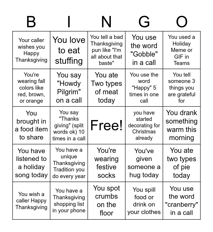This bingo card has a free space and 24 words: You have a unique Thanksgiving Tradition you do every year, You have a Thanksgiving shopping list in your phone, You ate Two types of meat today, You wish a caller Happy Thanksgiving, You used a Holiday Meme or GIF in Teams, Your caller wishes you Happy Thanksgiving, You're wearing fall colors like red, brown, or orange, You love to eat stuffing, you have started decorating for Christmas already, You're wearing festive socks, You use the word "Happy" 5 times in one call, You brought in a food item to share, You've given someone a hug today, You ate two types of pie today, You say "Howdy Pilgrim" on a call, You spill food or drink on your clothes, You drank something warm this morning, You tell a bad Thanksgiving pun like "I'm all about that baste", You tell someone 3 things you are grateful for, You say "Thanks giving" (split words ok) 10 times in a call, You use the word "cranberry" in a call, You have listened to a holiday song today, You use the word "Gobble" in a call and You spot crumbs on the floor.