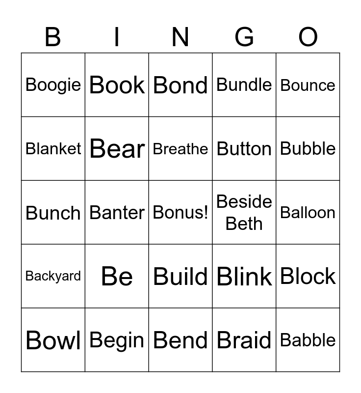 This bingo card has a free space and 24 words: Be, Begin, Breathe, Bowl, Bounce, Boogie, Blanket, Book, Beside Beth, Build, Button, Bunch, Blink, Block, Bear, Braid, Balloon, Bond, Bubble, Banter, Babble, Backyard, Bundle and Bend.