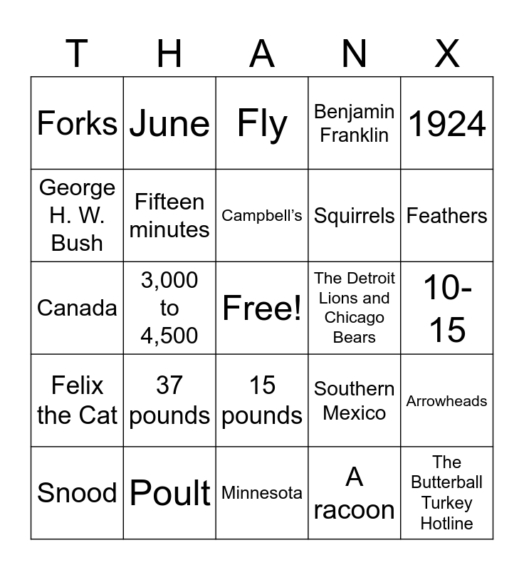 This bingo card has a free space and 35 words: 1621, Abraham Lincoln in 1863, Plumbers, Fifteen minutes, 15 pounds, Benjamin Franklin, George H. W. Bush, Hens, Campbell’s, Cranberries, Canada, 1924, Ripe cranberries, Wampanoag, Forks, The Detroit Lions and Chicago Bears, A racoon, 3,000 to 4,500, Felix the Cat, The Butterball Turkey Hotline, Southern Mexico, Snood, Arrowheads, Poult, Fly, Feathers, Gobbler, Christmas, Squirrels, 10-15, 30%, Minnesota, 37 pounds, June and Louisiana.
