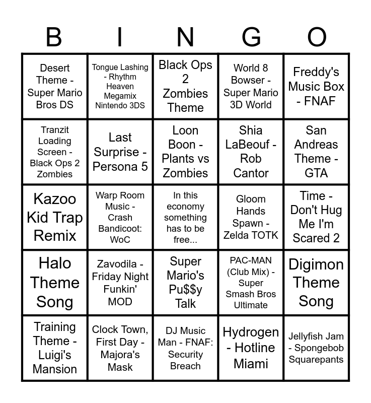 This bingo card has a free space and 35 words: Holding Out For a Hero - Jennifer Saunders, Chug Jug With You - Leviathan, I'm Nobody's Hero - Donkey Kong, Last Surprise - Persona 5, Super Mario's Pu$$y Talk, World 8 Bowser - Super Mario 3D World, Tranzit Loading Screen - Black Ops 2 Zombies, Psychosalad - The Wiggles, Loon Boon - Plants vs Zombies, Running In The 90's - Initial D, Kazoo Kid Trap Remix, Freddy's Music Box - FNAF, Home Depot Ahh Beat, Temple of Shrooms Disco - Paper Mario Origami King, Desert Theme - Super Mario Bros DS, Gloom Hands Spawn - Zelda TOTK, Hydrogen - Hotline Miami, Warp Room Music - Crash Bandicoot: WoC, Halo Theme Song, Jellyfish Jam - Spongebob Squarepants, PAC-MAN (Club Mix) - Super Smash Bros Ultimate, Training Theme - Luigi's Mansion, Digimon Theme Song, Clock Town, First Day - Majora's Mask, Black Ops 2 Zombies Theme, San Andreas Theme - GTA, Bare Bones - Sims 2, Sissy That Walk - RuPaul, Shia LaBeouf - Rob Cantor, Time - Don't Hug Me I'm Scared 2, Monk Maz Koshia - Zelda: Breath of The Wild, DJ Music Man - FNAF: Security Breach, Zavodila - Friday Night Funkin' MOD, Tongue Lashing - Rhythm Heaven Megamix Nintendo 3DS and Doot With the Sickness.