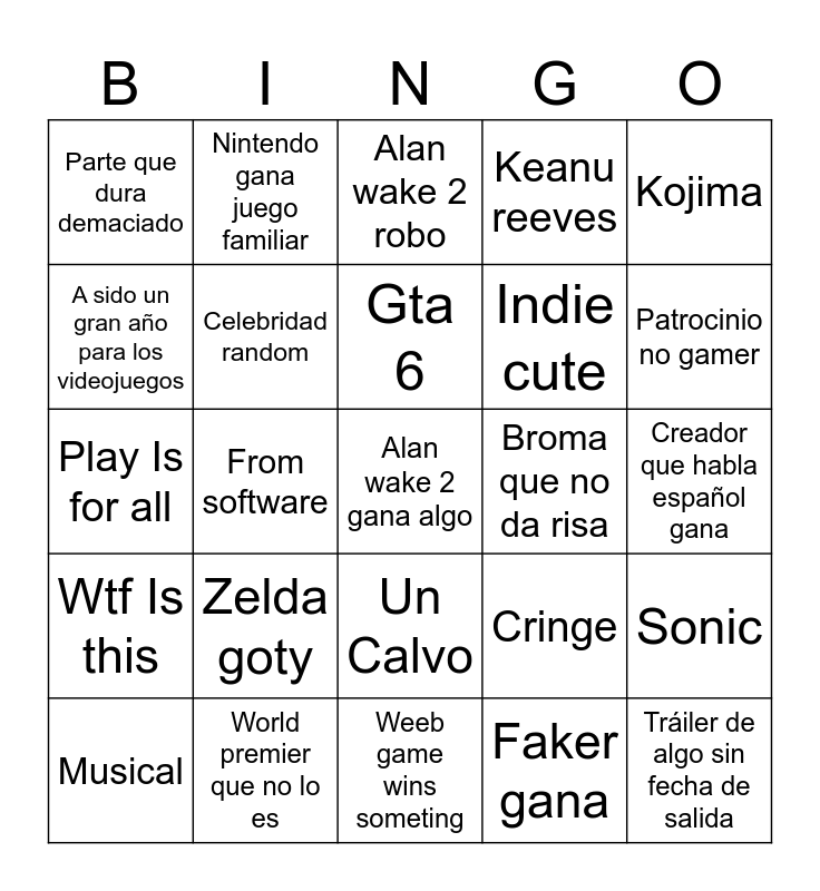 This bingo card has a free space and 24 words: Zelda goty, World premier que no lo es, Gta 6, Musical, Kojima, Parte que dura demaciado, A sido un gran año para los videojuegos, Nintendo gana juego familiar, Broma que no da risa, Un Calvo, Indie cute, Play Is for all, Cringe, Sonic, Celebridad random, Faker gana, Creador que habla español gana, Alan wake 2 robo, Patrocinio no gamer, From software, Tráiler de algo sin fecha de salida, Wtf Is this, Keanu reeves and Weeb game wins someting.