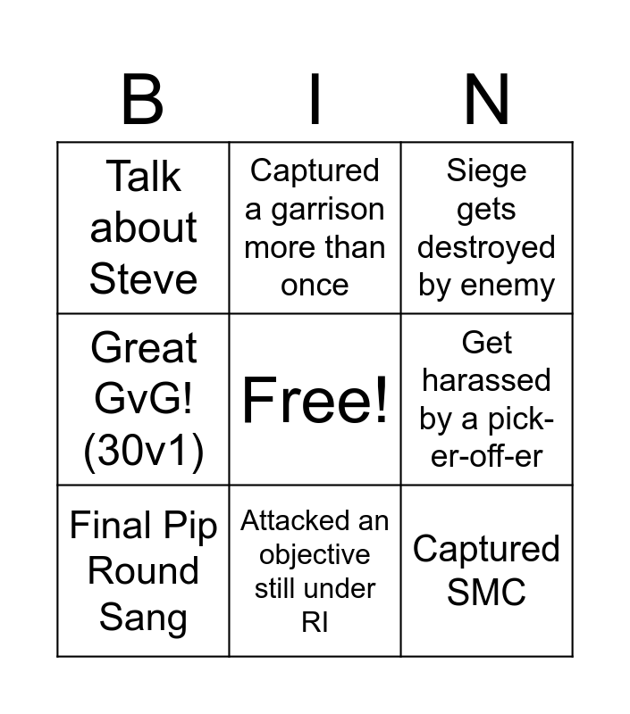 This bingo card has a free space and 14 words: Request for 9 Ruins, Talk of Pizza Pops, Final Pip Round Sang, Captured a garrison more than once, Great GvG! (30v1), Captured SMC, Golem Rush, Placed and used any defensive siege, Attacked an objective still under RI, Talk about Steve, Commander leads squad off cliff, Get harassed by a pick-er-off-er, Siege gets destroyed by enemy and Take Bloodlust (with squad).
