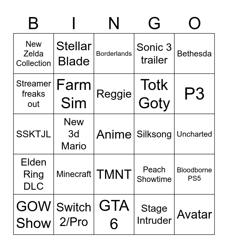 This bingo card has 25 words: Elden Ring DLC, Switch 2/Pro, Anime, Stage Intruder, Bethesda, New Zelda Collection, Stellar Blade, Borderlands, Silksong, Bloodborne PS5, Streamer freaks out, Farm Sim, GTA 6, Peach Showtime, P3, GOW Show, New 3d Mario, Reggie, Totk Goty, Uncharted, SSKTJL, Minecraft, TMNT, Sonic 3 trailer and Avatar.