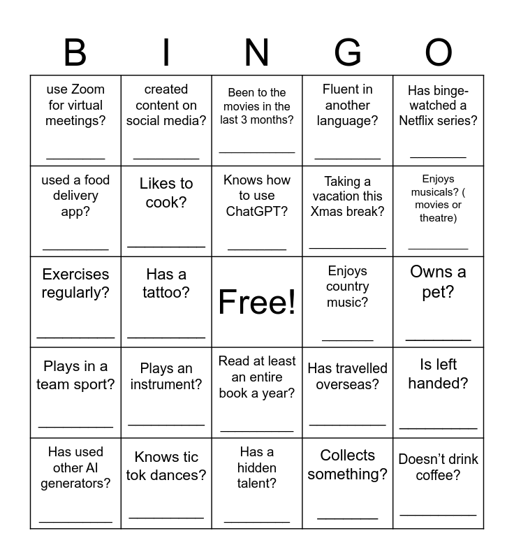 This bingo card has a free space and 24 words: Plays an instrument? __________, Knows tic tok dances? _________, Knows how to use ChatGPT? ________, Has used other AI generators? __________, Has binge-watched a Netflix series? ________, use Zoom for virtual meetings? ________, used a food delivery app? _________, created content on social media? _________, Enjoys country music? _______, Read at least an entire book a year? __________, Taking a vacation this Xmas break? ___________, Exercises regularly? _________, Has travelled overseas? __________, Is left handed? _________, Likes to cook? _________, Collects something? _______, Owns a pet? _______, Been to the movies in the last 3 months? ____________, Enjoys musicals? ( movies or theatre) __________, Has a tattoo? _________, Doesn’t drink coffee? __________, Plays in a team sport? _________, Fluent in another language? _________ and Has a hidden talent? _________.