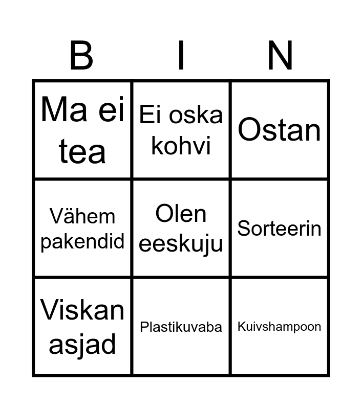 This bingo card has a free space and 8 words: Sorteerin, Ostan, Ei oska kohvi, Viskan asjad, Ma ei tea, Kuivshampoon, Vähem pakendid and Plastikuvaba.