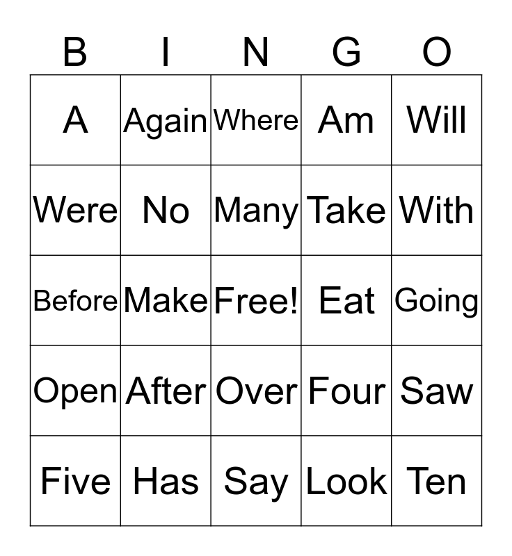 This bingo card has a free space and 24 words: After, Has, Many, Five, Will, A, Were, Again, Eat, Over, Take, Before, Four, Saw, No, Look, Going, Where, With, Make, Ten, Open, Am and Say.