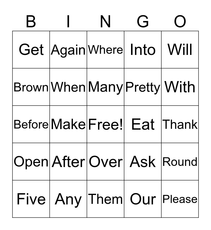 This bingo card has a free space and 24 words: After, Any, Many, Five, Will, Get, Brown, Again, Eat, Over, Pretty, Before, Ask, Round, When, Our, Thank, Where, With, Make, Please, Open, Into and Them.