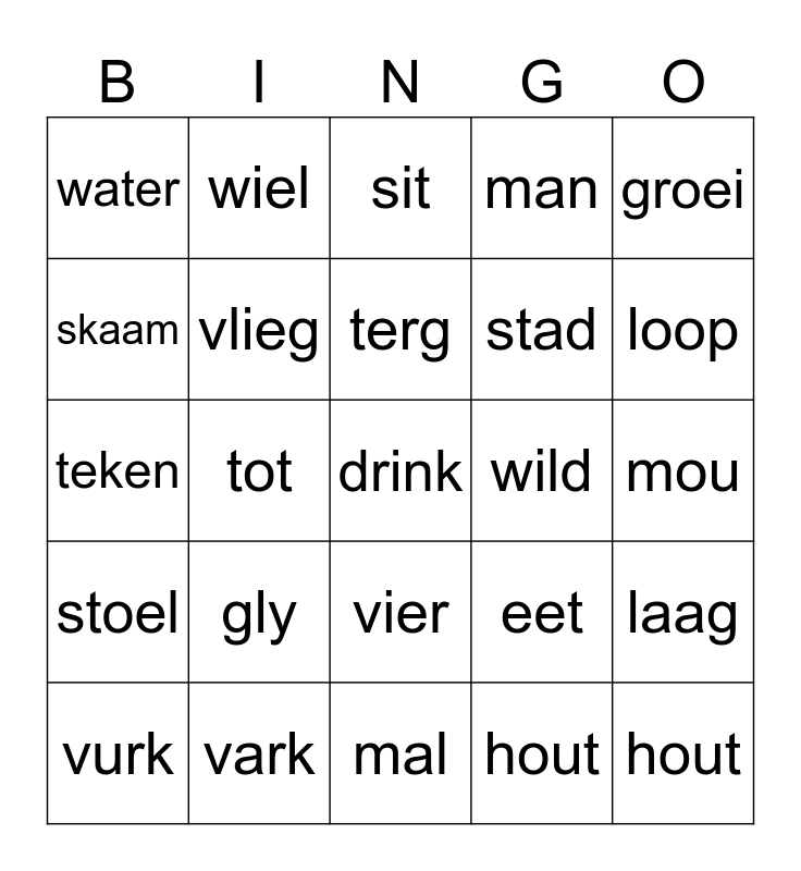 This bingo card has a free space and 24 words: gly, vark, terg, vurk, groei, water, skaam, wiel, wild, vier, stad, teken, eet, laag, vlieg, hout, mou, sit, loop, tot, hout, stoel, man and mal.