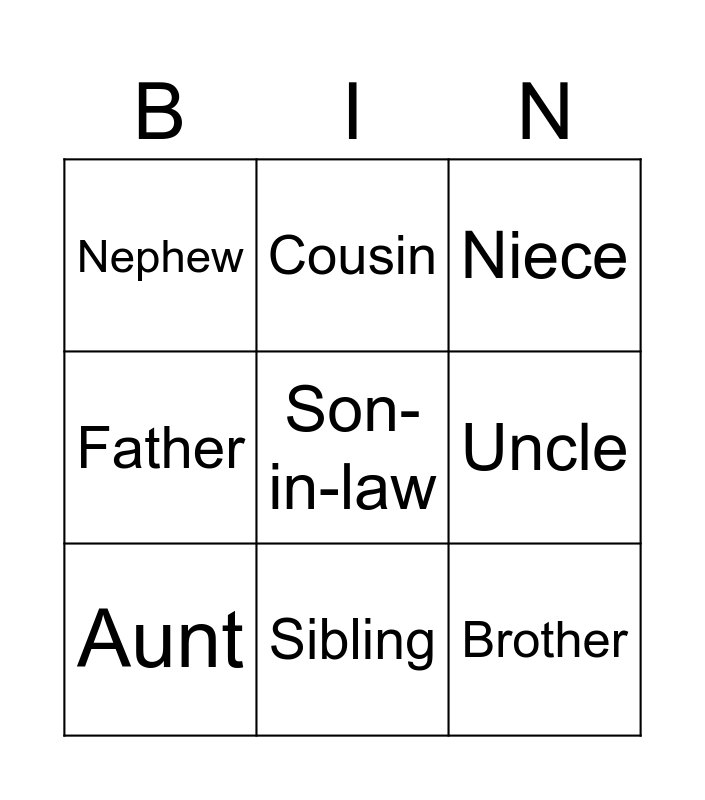 This bingo card has 15 words: Stepdaughter, Sister, Niece, Nephew, Sibling, Son-in-law, Twins, Half-brother, Uncle, Brother, Mother-in-law, Father, Aunt, Cousin and Grand father.