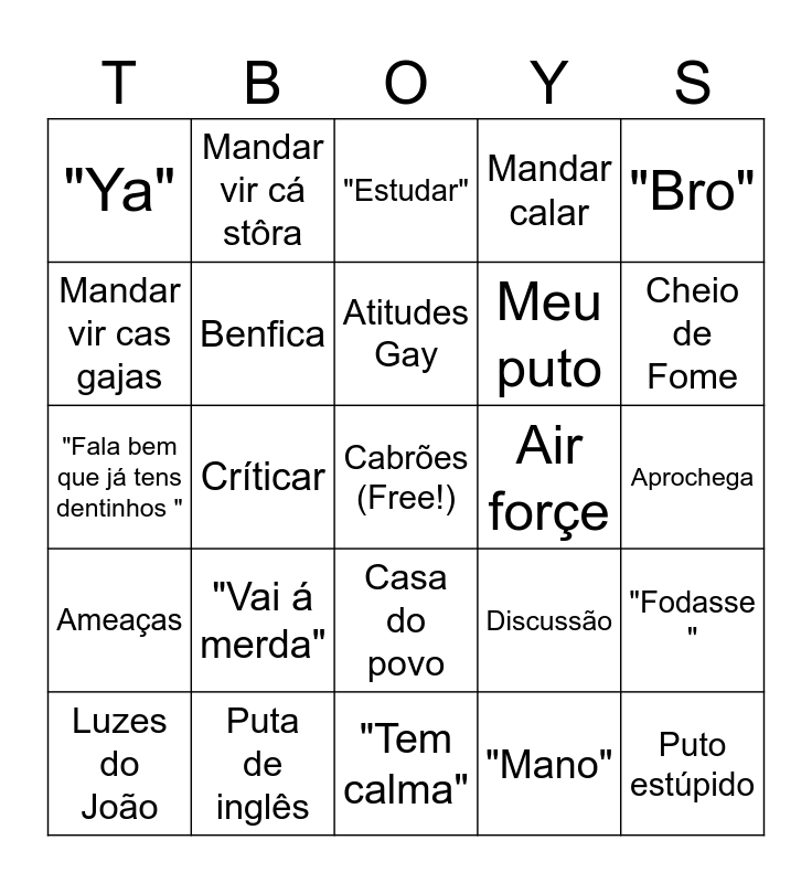 This bingo card has a free space and 39 words: "Quem?o caralho", Teimosia, Gritar, Discussão, "Fodasse ", Ameaças, Críticar, Outfit Check, Air forçe, Aprochega, Mandar vir cas gajas, Mandar vir cá stôra, Asneiras, Cheio de Fome, "Fala bem que já tens dentinhos ", "Vai á merda", Casa do povo, Mandar calar, Dani e os lenços, Luzes do João, Benfica, Atitudes Gay, "Mano", "Bro", Indiano, Puta de inglês, "Tem calma", "Porra", "Tiagão", "Ya", Port/ing, Nengue, Meu puto, Puto estúpido, Azias, português horrível, "Estudar", Estudar memo and Homofobia.