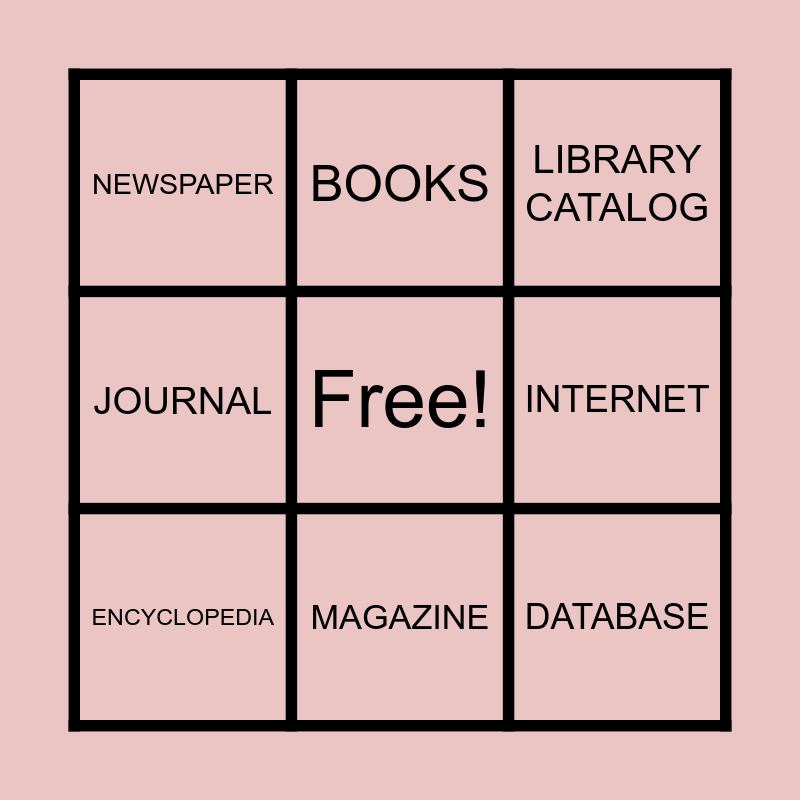 This bingo card has a free space and 8 words: INTERNET, LIBRARY CATALOG, BOOKS, ENCYCLOPEDIA, NEWSPAPER, DATABASE, JOURNAL and MAGAZINE.