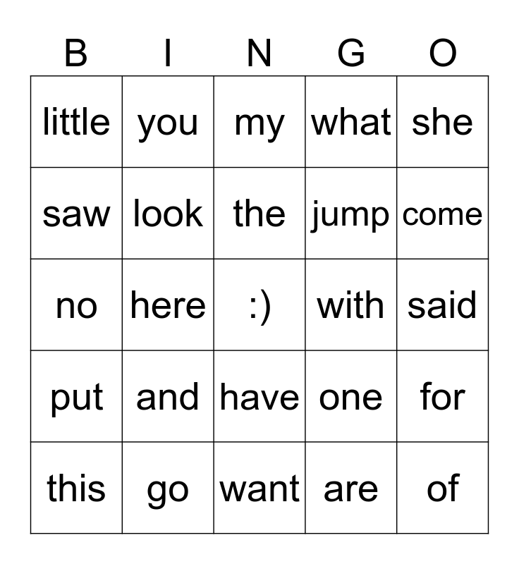 This bingo card has a free space and 24 words: and, go, the, this, she, little, saw, you, with, have, jump, no, one, for, look, are, said, my, come, here, of, put, what and want.