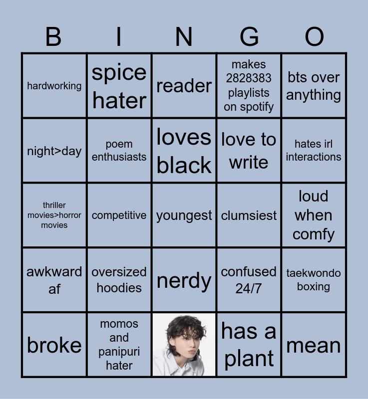 This bingo card has 1 images and 24 words: awkward af, momos and panipuri hater, youngest, has a plant, bts over anything, hardworking, spice hater, reader, clumsiest, taekwondo boxing, night>day, poem enthusiasts, confused 24/7, hates irl interactions, broke, competitive, loves black, love to write, loud when comfy, thriller movies>horror movies, oversized hoodies, nerdy, makes 2828383 playlists on spotify and mean.