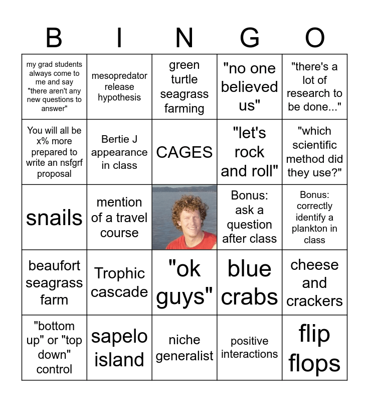 This bingo card has a free space and 24 words: Trophic cascade, sapelo island, CAGES, "bottom up" or "top down" control, "there's a lot of research to be done...", my grad students always come to me and say "there aren't any new questions to answer", You will all be x% more prepared to write an nsfgrf proposal, mesopredator release hypothesis, Bonus: ask a question after class, "ok guys", "let's rock and roll", snails, blue crabs, cheese and crackers, Bertie J appearance in class, positive interactions, Bonus: correctly identify a plankton in class, green turtle seagrass farming, "which scientific method did they use?", mention of a travel course, flip flops, beaufort seagrass farm, "no one believed us" and niche generalist.