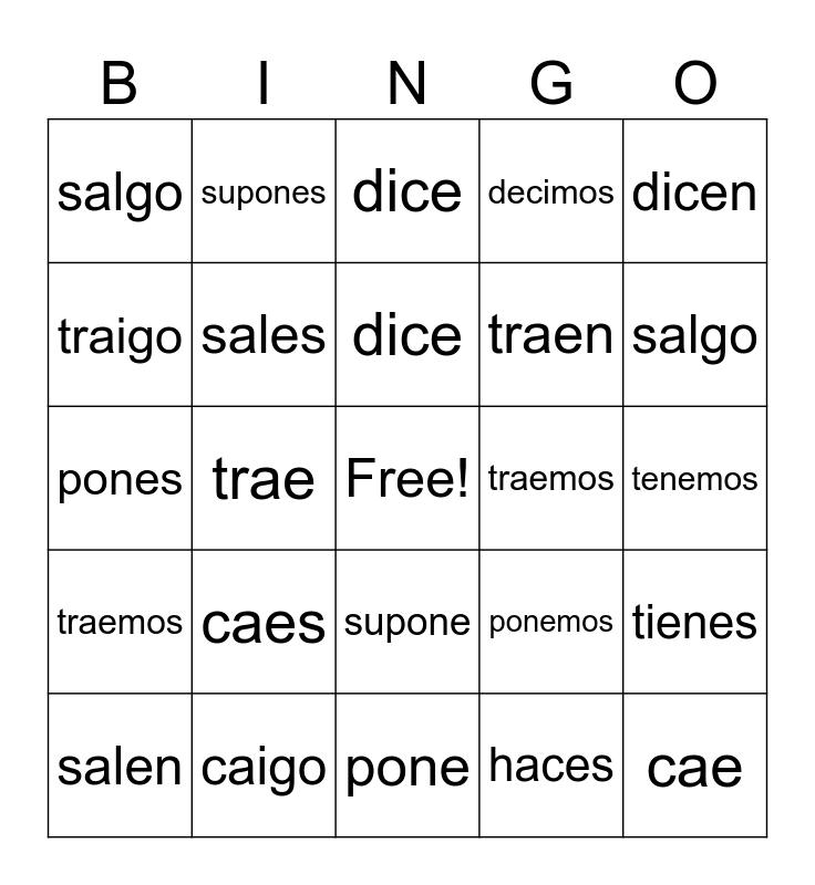 ⚠ This card has duplicate items: pongo (2), haces (2), sale (2), tenemos (2), dicen (3), digo (2), supones (2), cae (2), ponemos (2), suponen (2), traigo (2), tienes (2), salimos (2), hago (2), sales (2), dice (2), decimos (2), hacen (2), salgo (2), caes (2), pone (2), traemos (2), ponen (2), supone (2)