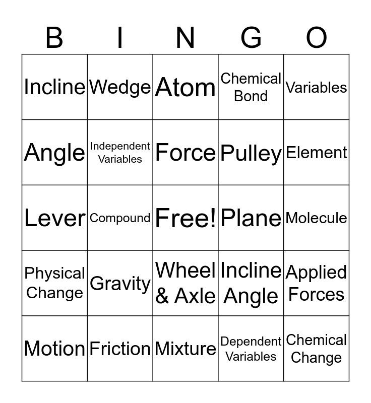 This bingo card has a free space and 24 words: Gravity, Friction, Force, Motion, Variables, Incline, Angle, Wedge, Plane, Wheel & Axle, Pulley, Lever, Incline Angle, Applied Forces, Independent Variables, Dependent Variables, Molecule, Atom, Element, Compound, Chemical Change, Physical Change, Chemical Bond and Mixture.