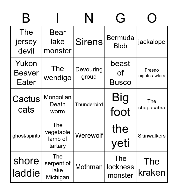 This bingo card has a free space and 31 words: Mothman, Loveland frog, Mongolian Death worm, Dover Demon, The jersey devil, Sirens, The wendigo, the yeti, Big foot, The lockness monster, The chupacabra, The kraken, The goatman, aliens, Fresno nightcrawlers, Cthulhu, Skinwalkers, The vegetable lamb of tartary, ghost/spirits, Werewolf, jackalope, phantom cats, shore laddie, Bear lake monster, beast of Busco, Yukon Beaver Eater, Bermuda Blob, Cactus cats, The serpent of lake Michigan, Devouring groud and El cuero.