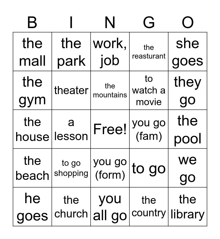 This bingo card has a free space and 24 words: to go shopping, the church, the mountains, he goes, she goes, the mall, the gym, the park, you go (fam), you go (form), to watch a movie, the house, to go, we go, theater, the country, the pool, work, job, they go, a lesson, the library, the beach, the reasturant and you all go.