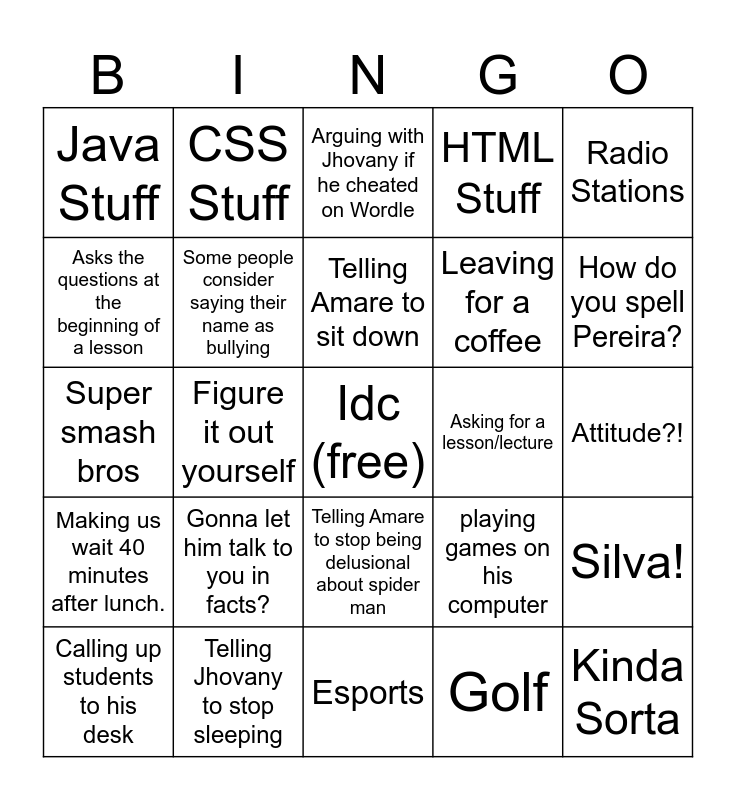 This bingo card has a free space and 24 words: Gonna let him talk to you in facts?, Telling Jhovany to stop sleeping, Telling Amare to sit down, Calling up students to his desk, Radio Stations, Java Stuff, Asks the questions at the beginning of a lesson, CSS Stuff, Asking for a lesson/lecture, Telling Amare to stop being delusional about spider man, Leaving for a coffee, Super smash bros, playing games on his computer, Silva!, Some people consider saying their name as bullying, Golf, Attitude?!, Arguing with Jhovany if he cheated on Wordle, How do you spell Pereira?, Figure it out yourself, Kinda Sorta, Making us wait 40 minutes after lunch., HTML Stuff and Esports.