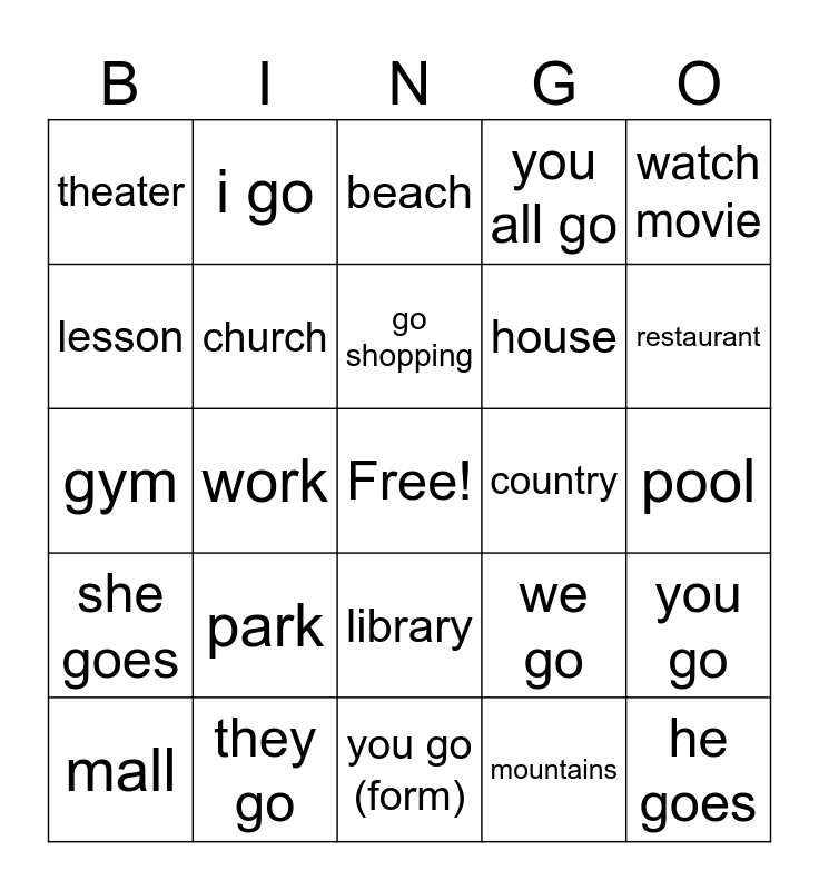 This bingo card has a free space and 24 words: park, they go, go shopping, mall, watch movie, theater, lesson, i go, country, library, house, gym, we go, you go, church, mountains, pool, beach, restaurant, work, he goes, she goes, you all go and you go (form).