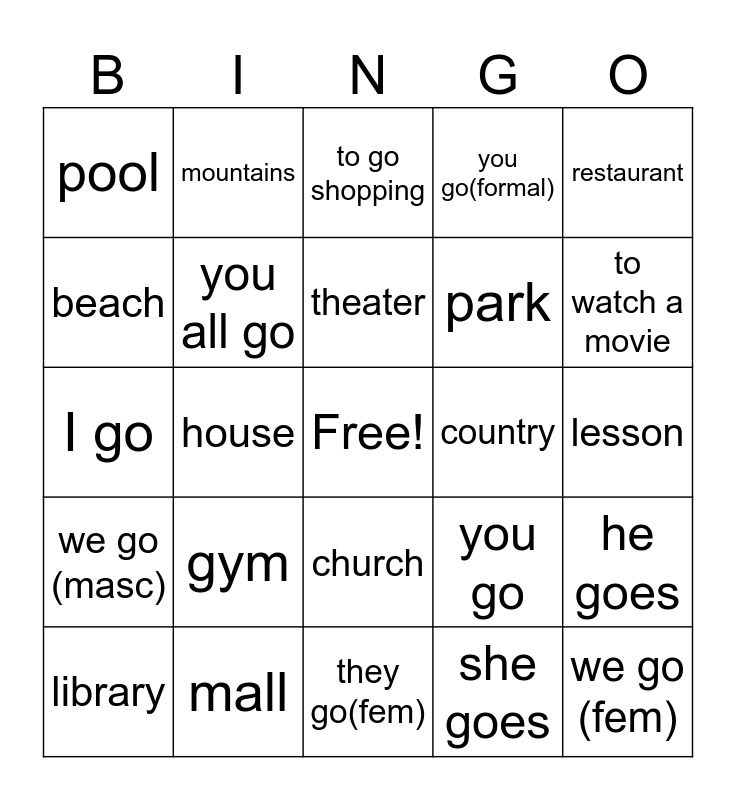 This bingo card has a free space and 24 words: gym, mall, theater, library, restaurant, pool, beach, mountains, country, church, park, I go, you go, he goes, you all go, she goes, lesson, to go shopping, to watch a movie, house, we go (fem), we go (masc), you go(formal) and they go(fem).