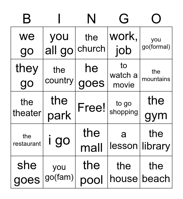 This bingo card has a free space and 24 words: i go, you go(fam), he goes, she goes, you go(formal), we go, they go, you all go, to go shopping, the mall, to watch a movie, the theater, a lesson, the library, the country, the house, the gym, the church, the mountains, the park, the beach, the restaurant, work, job and the pool.