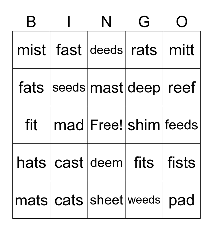 This bingo card has a free space and 24 words: cast, cats, mast, mats, mitt, mist, fats, fast, shim, deem, deep, fit, fits, fists, seeds, weeds, feeds, deeds, reef, mad, pad, hats, rats and sheet.