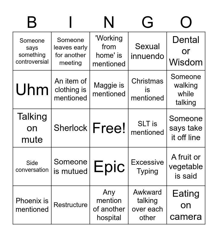 This bingo card has a free space and 24 words: Someone is mutued, Restructure, Maggie is mentioned, Phoenix is mentioned, Dental or Wisdom, Someone says something controversial, Uhm, Someone leaves early for another meeting, SLT is mentioned, Epic, Christmas is mentioned, Talking on mute, Excessive Typing, A fruit or vegetable is said, An item of clothing is mentioned, Awkward talking over each other, Someone says take it off line, 'Working from home' is mentioned, Someone walking while talking, Sherlock, Eating on camera, Side conversation, Sexual innuendo and Any mention of another hospital.