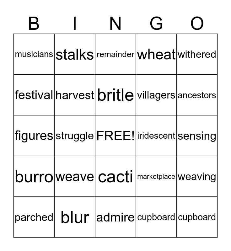 This bingo card has a free space and 39 words: hummingbird, rooster, side by side, harvest, parched, cacti, britle, nectar, withered, burro, struggle, wheat, cupboard, sensing, iridescent, weave, transform, musicians, explore, marketplace, festival, admire, villagers, ancestors, blossom, gift, sugar, crop, dusk, stalks, cacti, withered, remainder, blur, cupboard, darted, weaving, figures and transformed.