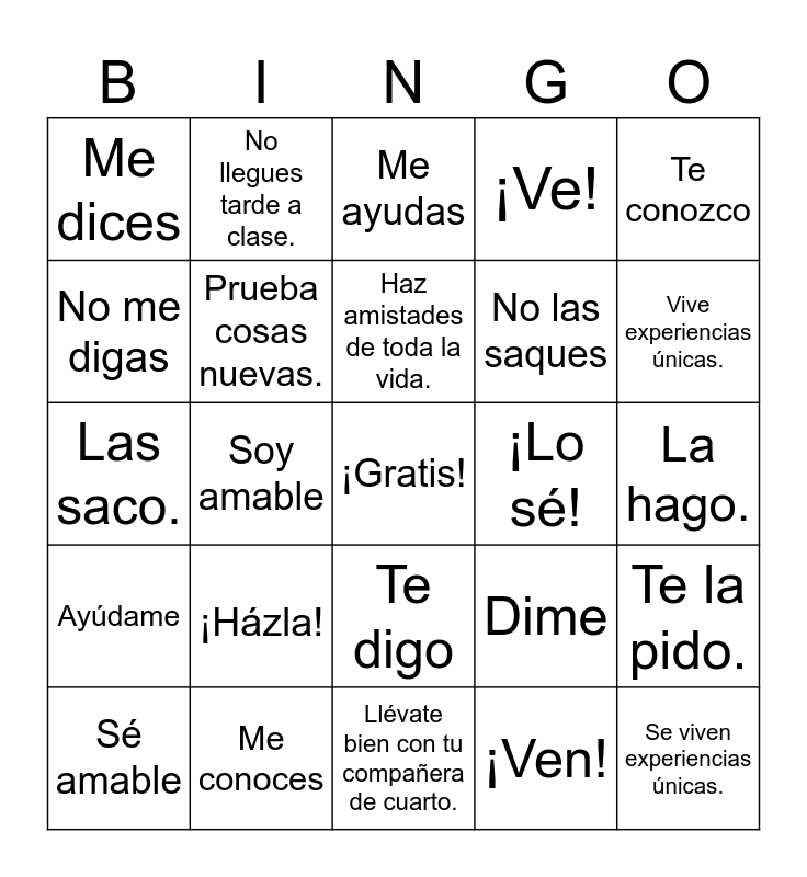 This bingo card has a free space and 24 words: ¡Házla!, Me conoces, Haz amistades de toda la vida., Sé amable, Te conozco, Me dices, No me digas, No llegues tarde a clase., ¡Lo sé!, Te digo, No las saques, Las saco., Dime, Te la pido., Prueba cosas nuevas., ¡Ven!, La hago., Me ayudas, Vive experiencias únicas., Soy amable, Se viven experiencias únicas., Ayúdame, ¡Ve! and Llévate bien con tu compañera de cuarto..