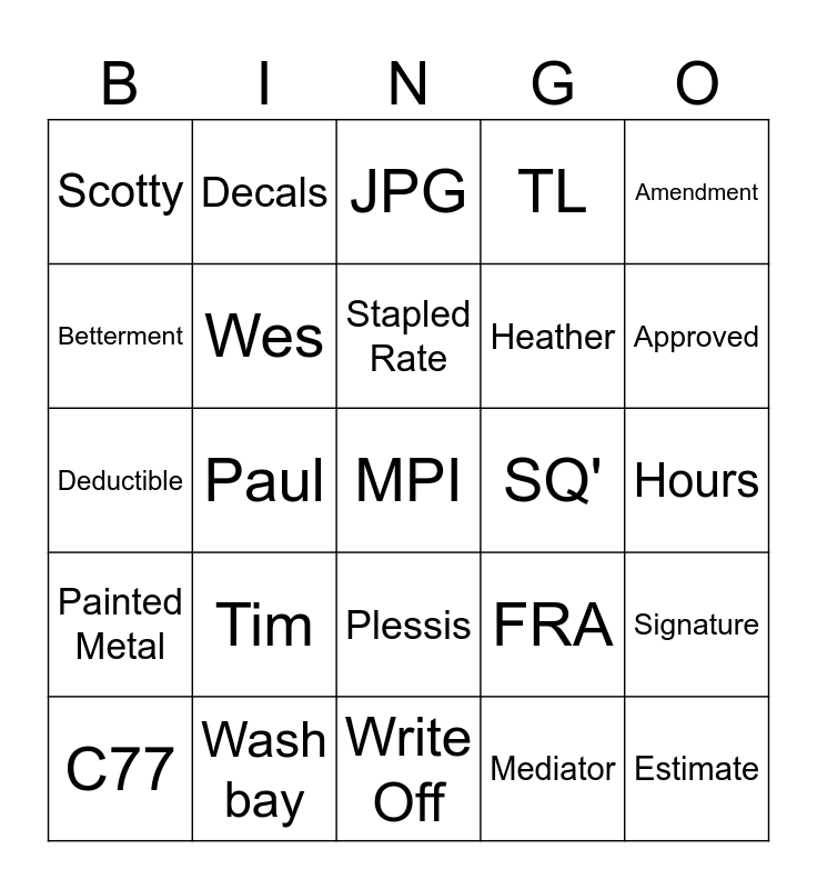 This bingo card has a free space and 24 words: Tim, Wash bay, Stapled Rate, C77, Amendment, Scotty, Betterment, Decals, SQ', Plessis, Heather, Deductible, FRA, Signature, Wes, Mediator, Hours, JPG, Approved, Paul, Estimate, Painted Metal, TL and Write Off.