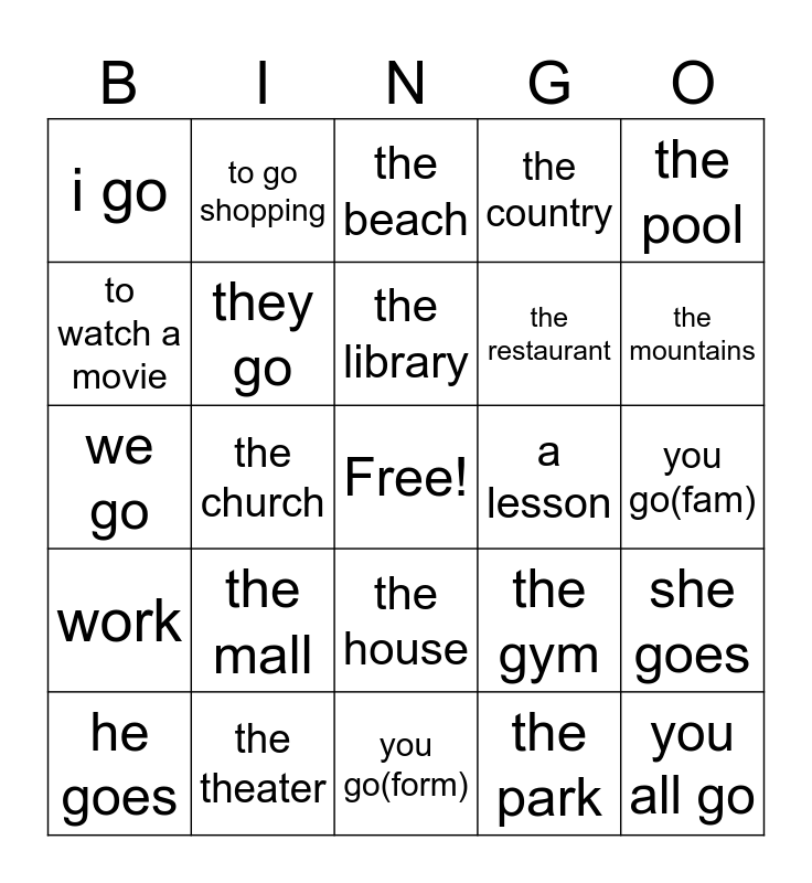 This bingo card has a free space and 24 words: the mall, the theater, the library, he goes, the pool, i go, to watch a movie, to go shopping, a lesson, the house, the restaurant, we go, the gym, she goes, they go, the park, you go(fam), the beach, the mountains, the church, you all go, work, the country and you go(form).