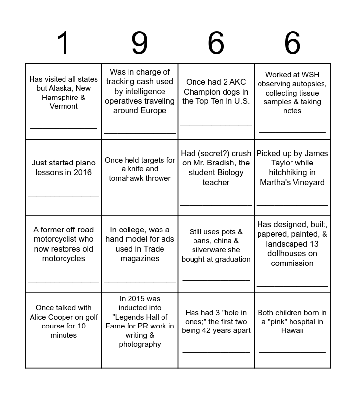 This bingo card has a free space and 15 words: Once talked with Alice Cooper on golf course for 10 minutes ________________, Both children born in a "pink" hospital in Hawaii ________________, Once had 2 AKC Champion dogs in the Top Ten in U.S. ________________, Has visited all states but Alaska, New Hamsphire & Vermont ________________, Picked up by James Taylor while hitchhiking in Martha's Vineyard ________________, Just started piano lessons in 2016 ________________, In college, was a hand model for ads used in Trade magazines ________________, Has had 3 "hole in ones;" the first two being 42 years apart ________________, Once held targets for a knife and tomahawk thrower ________________, A former off-road motorcyclist who now restores old motorcycles ________________, Has designed, built, papered, painted, & landscaped 13 dollhouses on commission ________________, Worked at WSH observing autopsies, collecting tissue samples & taking notes ________________, Had (secret?) crush on Mr. Bradish, the student Biology teacher ________________, Was in charge of tracking cash used by intelligence operatives traveling around Europe ________________ and In 2015 was inducted into "Legends Hall of Fame for PR work in writing & photography ________________.