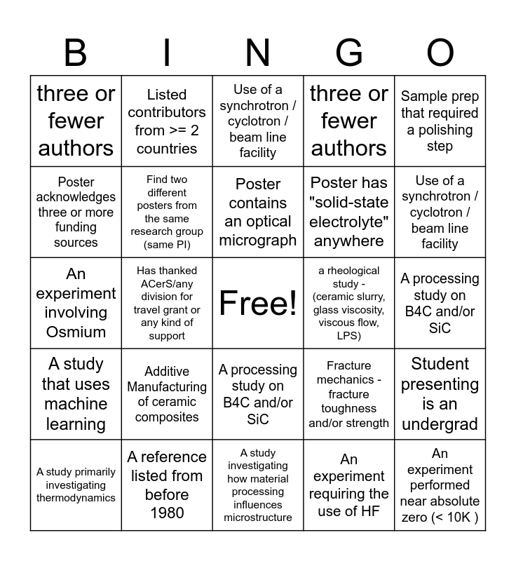 This bingo card has a free space and 44 words: Additive Manufacturing of ceramic composites, An experiment performed near absolute zero (< 10K ), A study investigating how material processing influences microstructure, A study primarily investigating thermodynamics, An experiment involving Osmium, An experiment requiring the use of HF, Use of a synchrotron / cyclotron / beam line facility, Listed contributors from >= 2 countries, Sample prep that required a polishing step, A reference listed from before 1980, three or fewer authors, a rheological study - (ceramic slurry, glass viscosity, viscous flow, LPS), A processing study on B4C and/or SiC, Additive Manufacturing of ceramic composites, An experiment performed near absolute zero (< 10K ), A study investigating how material processing influences microstructure, A study primarily investigating thermodynamics, An experiment involving Osmium, An experiment requiring the use of HF 🙈, Use of a synchrotron / cyclotron / beam line facility, Listed contributors from >= 2 countries, Sample prep that required a polishing step (though this wouldn't be listed on a poster so the audience would have to know a bit about processing ...), A reference listed from before 2000 ( or 1990/1980), three or fewer authors, a rheological study - (ceramic slurry, glass viscosity, viscous flow, LPS), A processing study on B4C and/or SiC, A synthesis study of an oxide doped with rare earth metals, Flash sintering - dogbones, pellets, etc., Fracture mechanics - fracture toughness and/or strength, A study that uses machine learning, A study that uses DFT caluclations, Student presenting is an undergrad, Application in hypersonics, Poster has more than 5 images, Has thanked ACerS/any division for travel grant or any kind of support, Use of TEM for microscopy, Poster has more than 7 references, Material under investigation is "high-entropy", Poster contains an optical micrograph, Poster acknowledges three or more funding sources, Poster has "solid-state electrolyte" anywhere, Poster has the presenting author who is NOT listed first on the poster, Find two different posters from the same research group (same PI) and Get the presenter to say, "that's an interesting question, I hadn't thought of that before" (or similar).