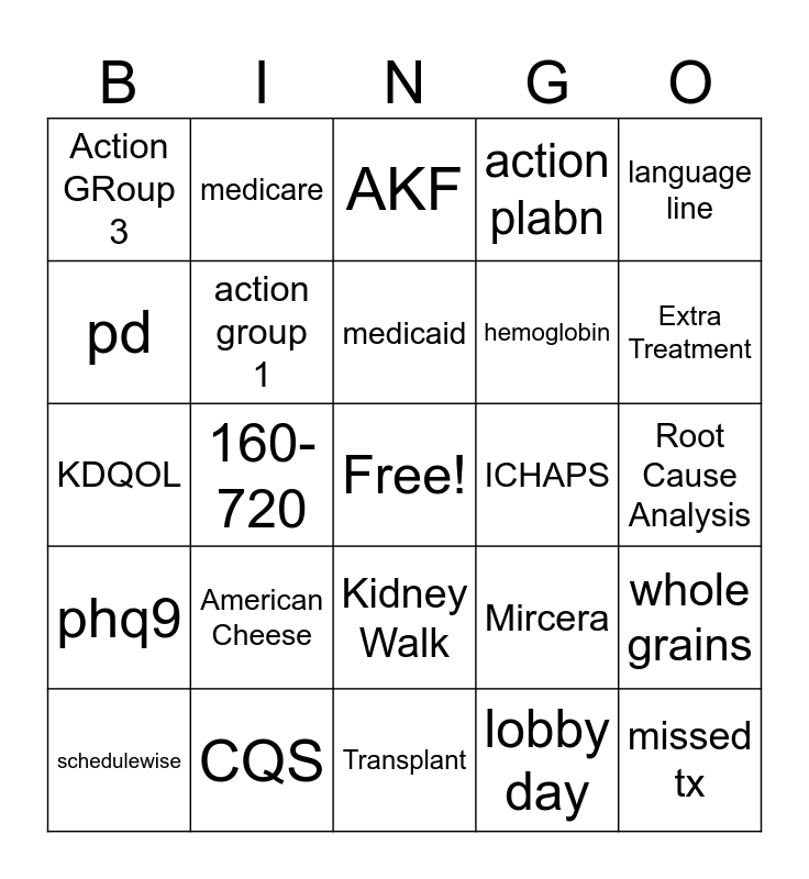This bingo card has a free space and 34 words: albumin, lobby day, freseniusrx, action group 2, phq9, action group 1, language line, schedulewise, medicare, phq2, medicaid, AKF, Velphoro PAP, 1.2, ICHAPS, Extra Treatment, CQS, KDQOL, American Cheese, Mircera, Kidney Walk, EQUIP, Action GRoup 3, Root Cause Analysis, Transplant, missed tx, action plabn, apple pie, hemoglobin, pd, cia/poc, 160- 720, whole grains and nkf.
