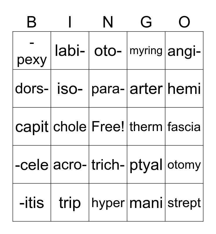 This bingo card has a free space and 25 words: acro-, hyper, para-, -itis, angi-, -pexy, dors-, labi-, therm, trich-, arter, capit, ptyal, otomy, iso-, helio, fascia, oto-, hemi, chole, strept, trip, -cele, myring and mani.