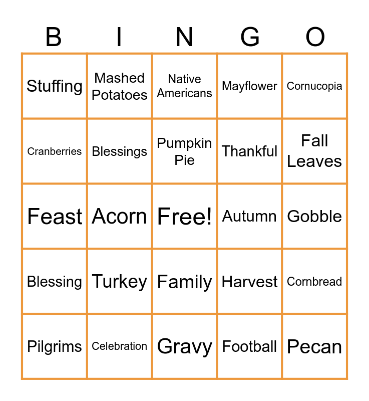This bingo card has a free space and 25 words: Turkey, Gravy, Pumpkin Pie, Pilgrims, Cornucopia, Stuffing, Cranberries, Mashed Potatoes, Autumn, Family, Thankful, Feast, Harvest, Cornbread, Blessings, Apple Pie, Gobble, Native Americans, Fall Leaves, Acorn, Pecan, Celebration, Blessing, Mayflower and Football.
