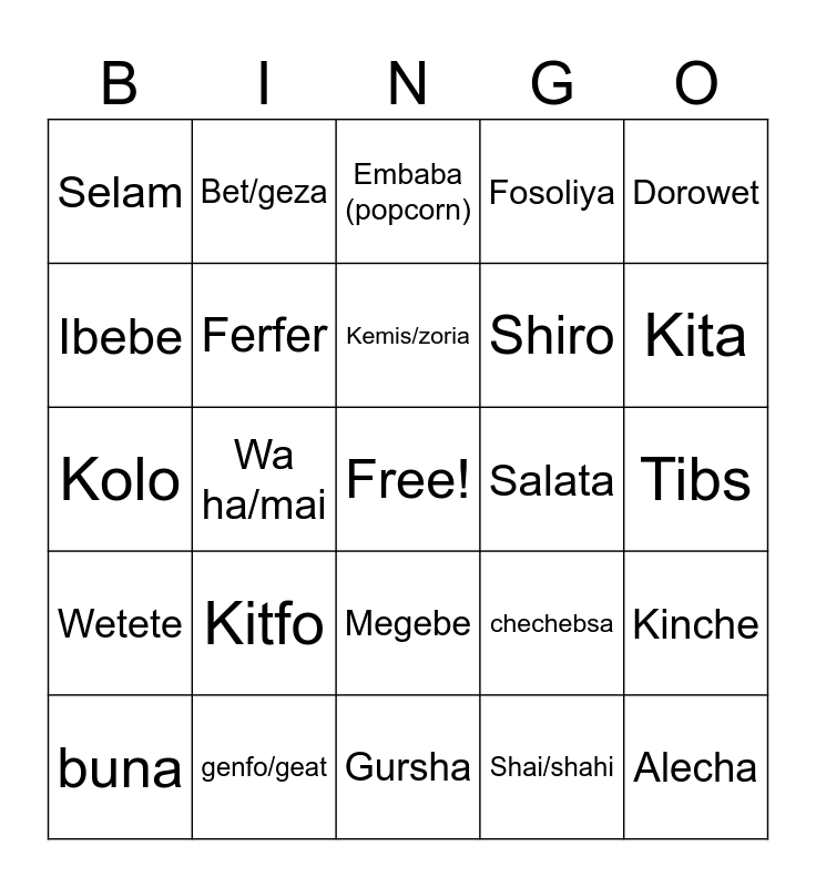 This bingo card has a free space and 24 words: buna, Kitfo, Kemis/zoria, Shai/shahi, Dorowet, Selam, Bet/geza, Embaba (popcorn), Salata, Tibs, Kolo, Ferfer, chechebsa, Kinche, Ibebe, genfo/geat, Gursha, Fosoliya, Kita, Wetete, Wa ha/mai, Megebe, Shiro and Alecha.