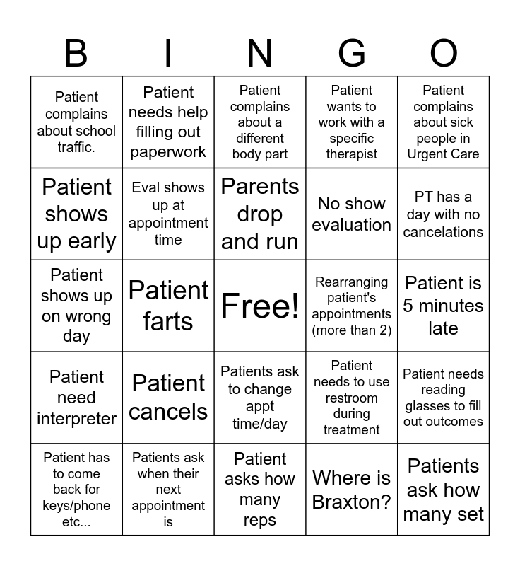 This bingo card has a free space and 24 words: Patient cancels, Patients ask when their next appointment is, Parents drop and run, Patient has to come back for keys/phone etc..., Patient complains about sick people in Urgent Care, Patient complains about school traffic., Patient shows up early, Patient needs help filling out paperwork, Rearranging patient's appointments (more than 2), Patients ask to change appt time/day, No show evaluation, Patient shows up on wrong day, Patient needs to use restroom during treatment, Patient needs reading glasses to fill out outcomes, Eval shows up at appointment time, Where is Braxton?, Patient is 5 minutes late, Patient complains about a different body part, PT has a day with no cancelations, Patient farts, Patients ask how many set, Patient need interpreter, Patient wants to work with a specific therapist and Patient asks how many reps.