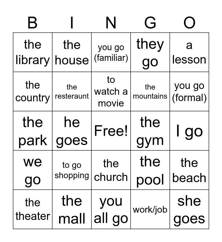 This bingo card has a free space and 24 words: to go shopping, the mall, to watch a movie, the theater, a lesson, the library, the country, the house, the gym, the church, the mountains, the park, the pool, the beach, the resteraunt, work/job, I go, you go (familiar), you go (formal), he goes, she goes, we go, they go and you all go.