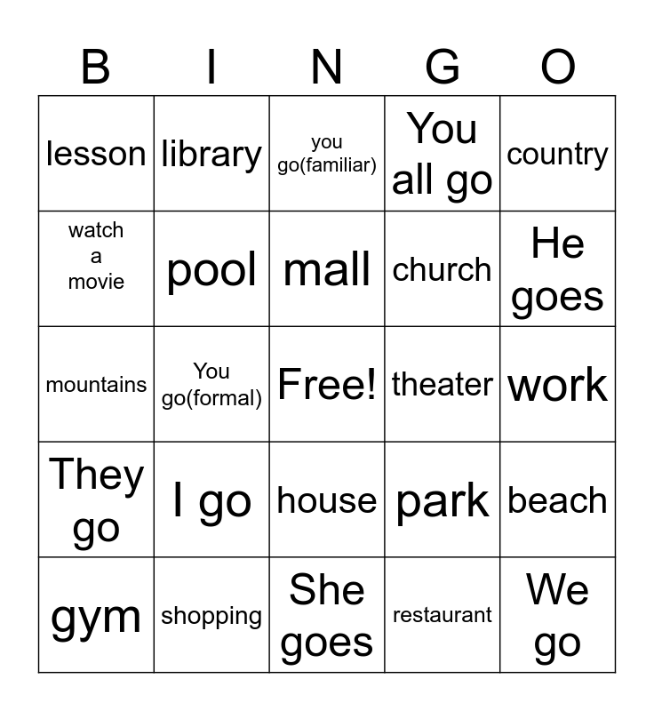 This bingo card has a free space and 24 words: I go, shopping, mall, gym, country, lesson, watch a movie, library, theater, house, church, mountains, park, beach, pool, restaurant, work, you go(familiar), He goes, You go(formal), We go, They go, You all go and She goes.
