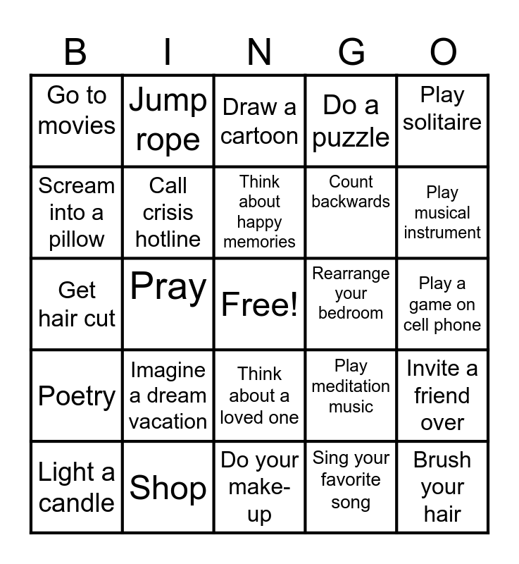 This bingo card has a free space and 52 words: Talk to family or friend, Brush your hair, Listen to music, Do your make-up, Imagine a dream vacation, Go for a walk, Jump rope, Play basketball, Scream into a pillow, Go listen to nature, Call crisis hotline, String a necklace, Invite a friend over, Play meditation music, Smell a flower, Drink tea/Hot chocolate, Think about happy memories, Rearrange your bedroom, Shred paper, Play solitaire, Pray, Sing your favorite song, Go to movies, Count backwards, Exercise, Watch TV, Cooking, Journal, Play musical instrument, Read a book, Stress ball, Do a puzzle, Take a time out, Blog, Read, Draw a cartoon, Shop, Dance to music, Gardening, Do a crossword puzzle, Volunteer, Play a game on cell phone, Poetry, Look at social media, Think about a loved one, Yoga, Massage, Get hair cut, Draw, Take a hot bath, Light a candle and Play with your pet.