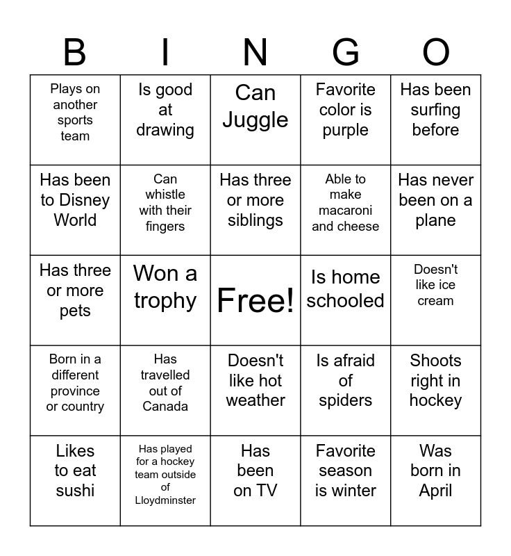 This bingo card has a free space and 24 words: Has travelled out of Canada, Has played for a hockey team outside of Lloydminster, Has three or more siblings, Likes to eat sushi, Has been surfing before, Plays on another sports team, Has been to Disney World, Is good at drawing, Is home schooled, Doesn't like hot weather, Able to make macaroni and cheese, Has three or more pets, Is afraid of spiders, Shoots right in hockey, Can whistle with their fingers, Favorite season is winter, Doesn't like ice cream, Can Juggle, Has never been on a plane, Won a trophy, Was born in April, Born in a different province or country, Favorite color is purple and Has been on TV.