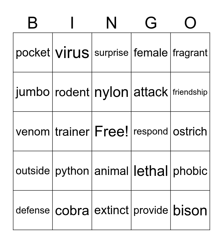 This bingo card has a free space and 24 words: python, cobra, nylon, defense, fragrant, pocket, jumbo, virus, respond, animal, attack, venom, lethal, phobic, rodent, provide, ostrich, surprise, friendship, trainer, bison, outside, female and extinct.
